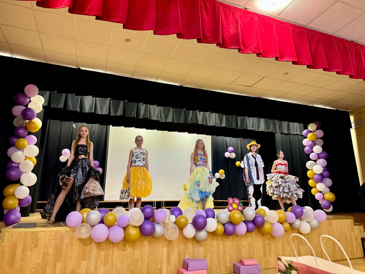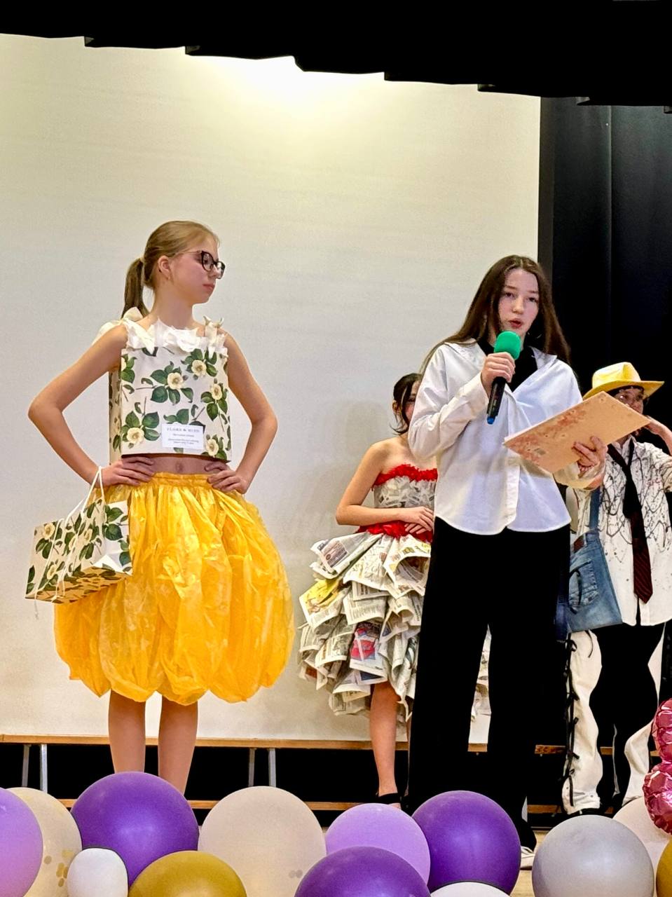 Юные дизайнеры отлично справились с этой задачей. Например, 7Ш класс поднял вопрос отношения к старым книгам и создал платье, состоящее из бумажных страниц. 7О класс рассказал о разумном потреблении одежды и апсайклинге. 7П и 7Э обыграли тему мусорных пакетов, а 8Э создал целый манифест защиты планеты от мусора в образе умирающей природы.