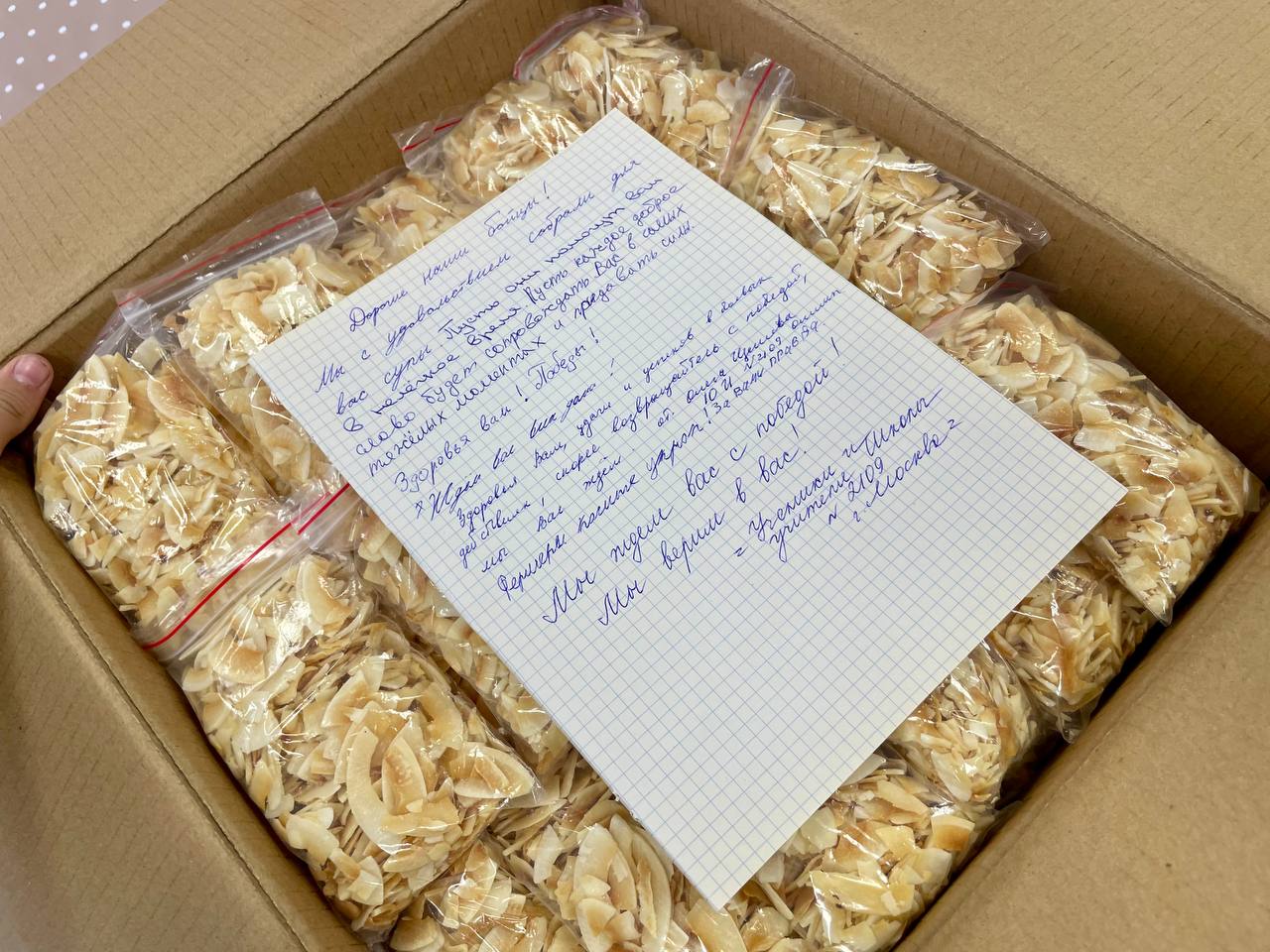 После того, как коробка была полностью укомплектована, ребята написали письмо бойцам и оно вместе с собранными супчиками уедет на фронт.