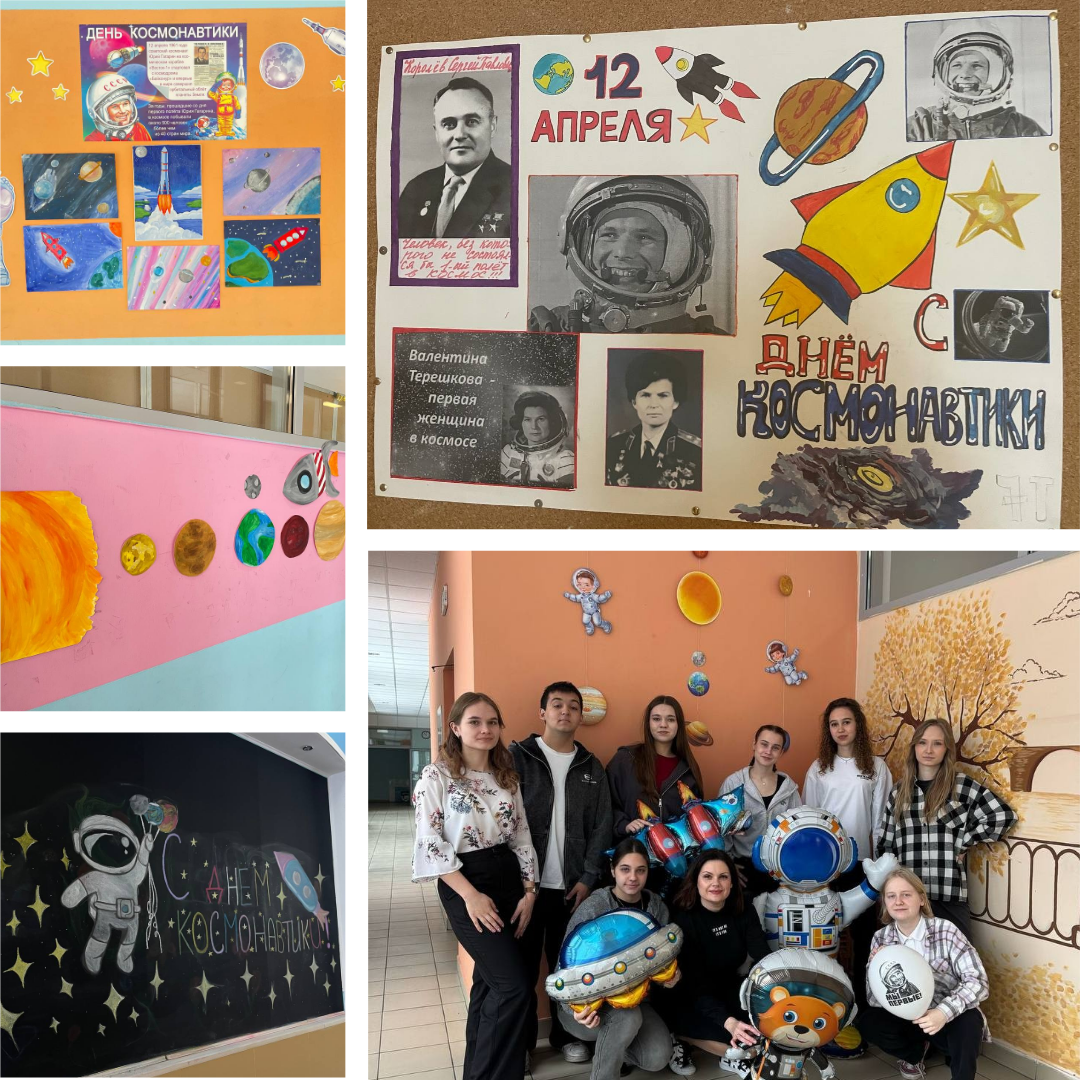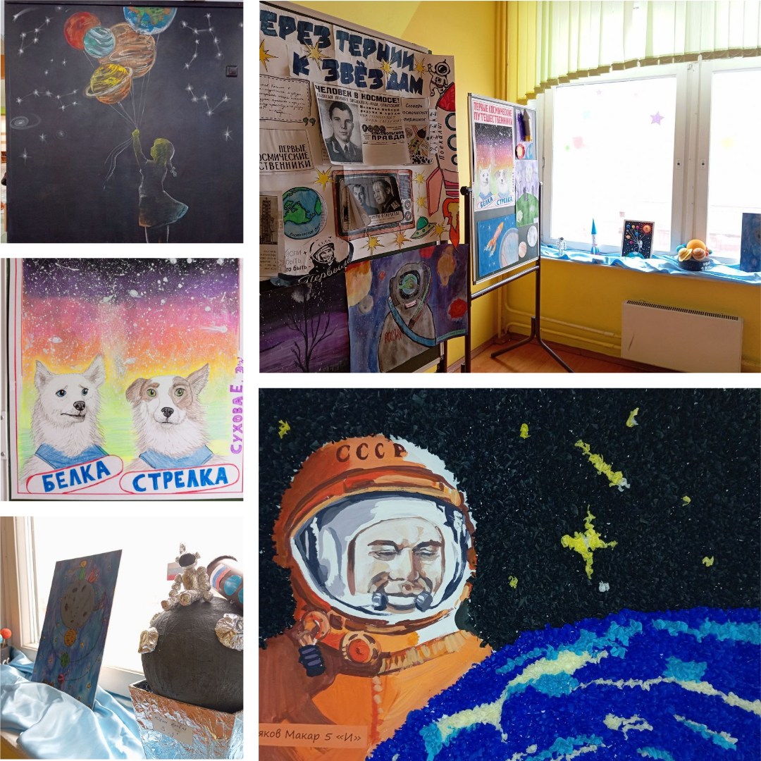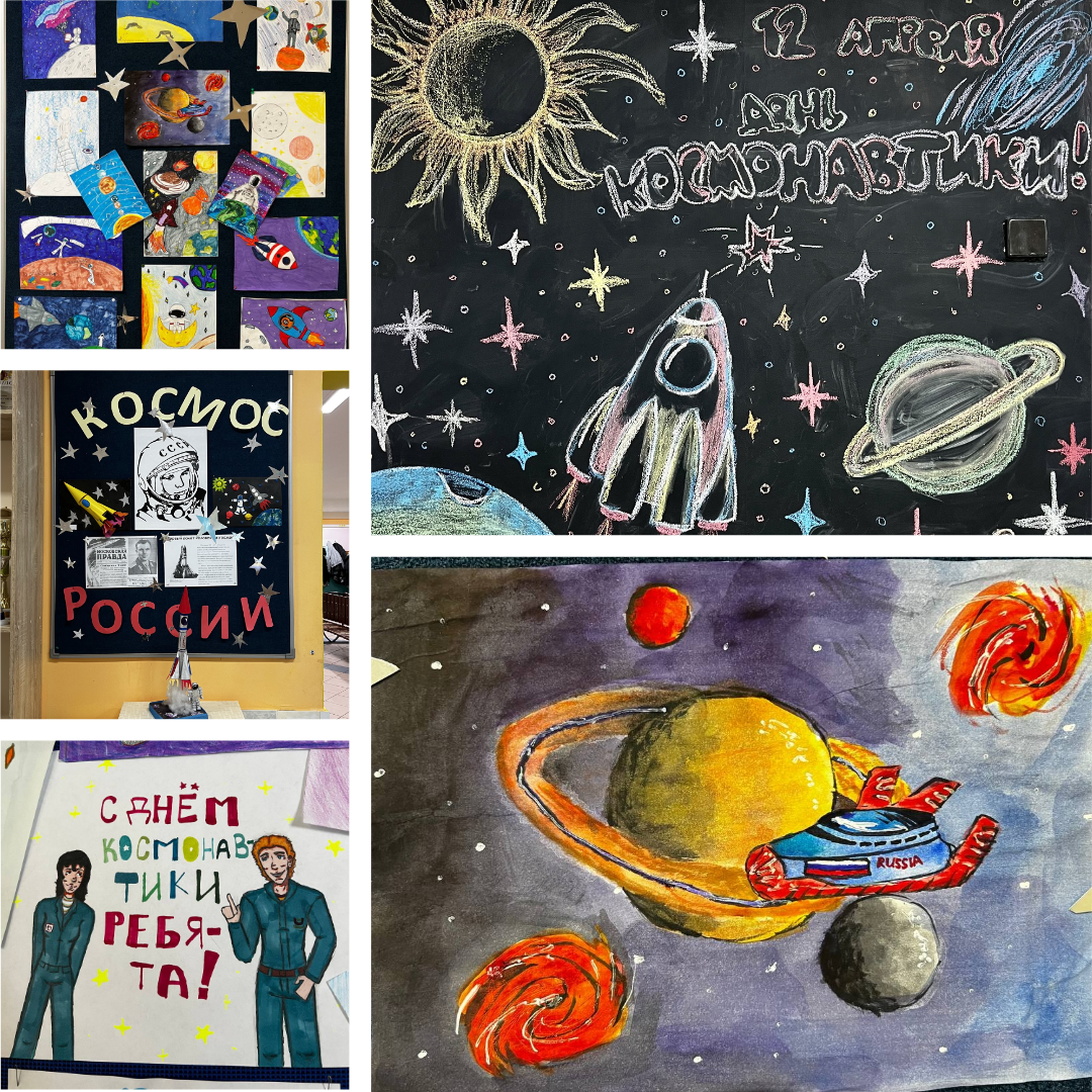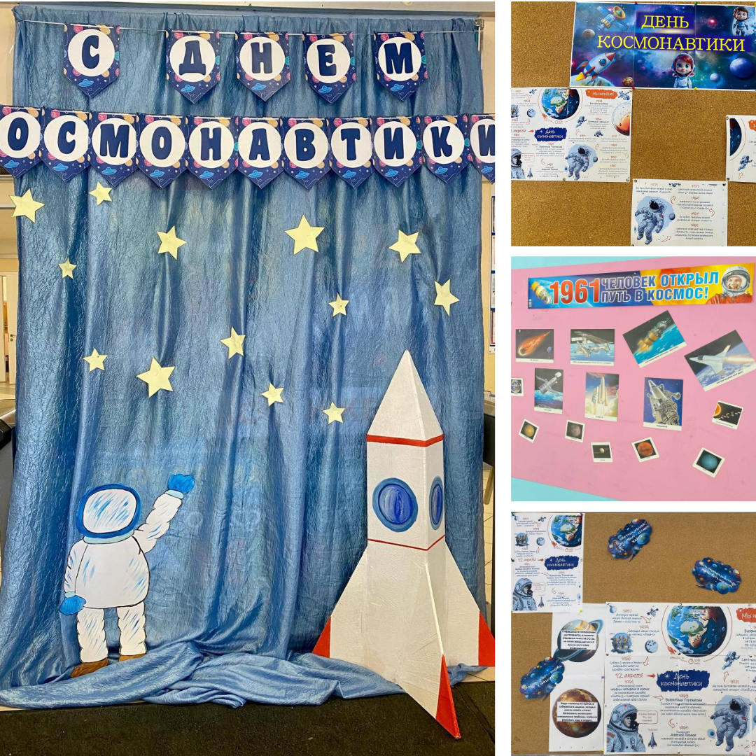 В школьных холлах можно увидеть тематические выставки рисунков и поделок, информационные стенды, посвящённые первому полёту человека в космос, а также необычные инсталляции.