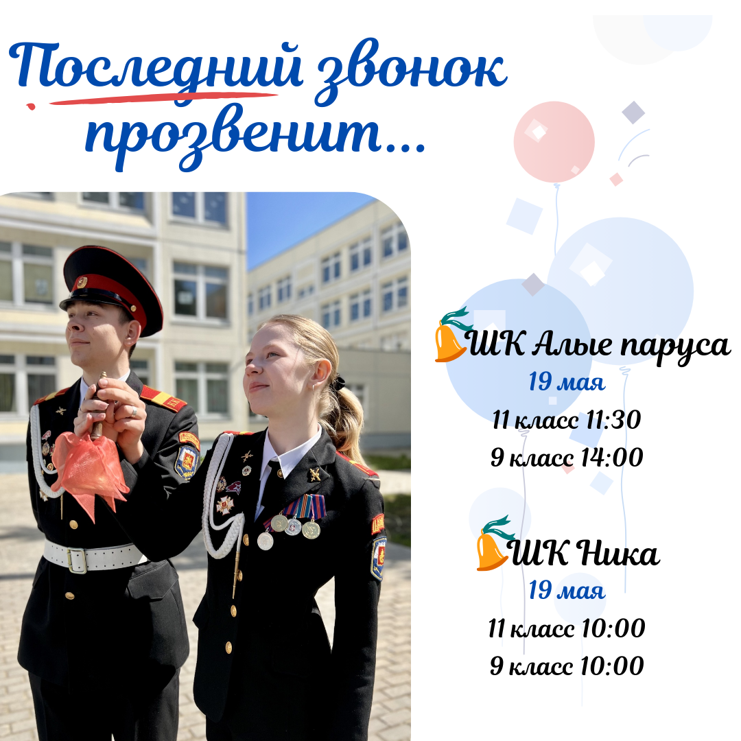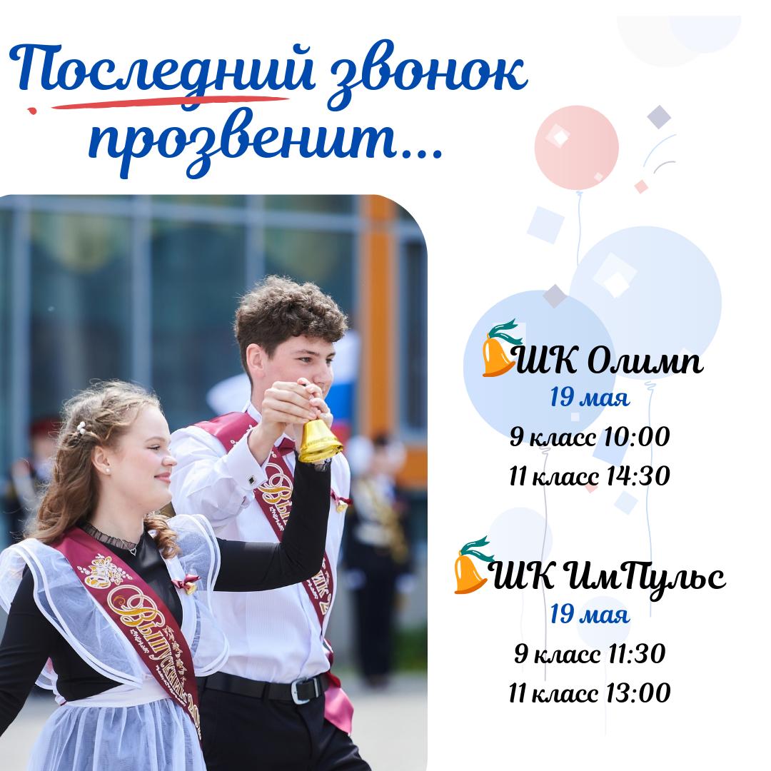 Последний звонок прозвучит во дворах школьных отделений «Олимп», «Алые паруса», «ИмПульс» и «Ника». Точное время указано в объявлении.