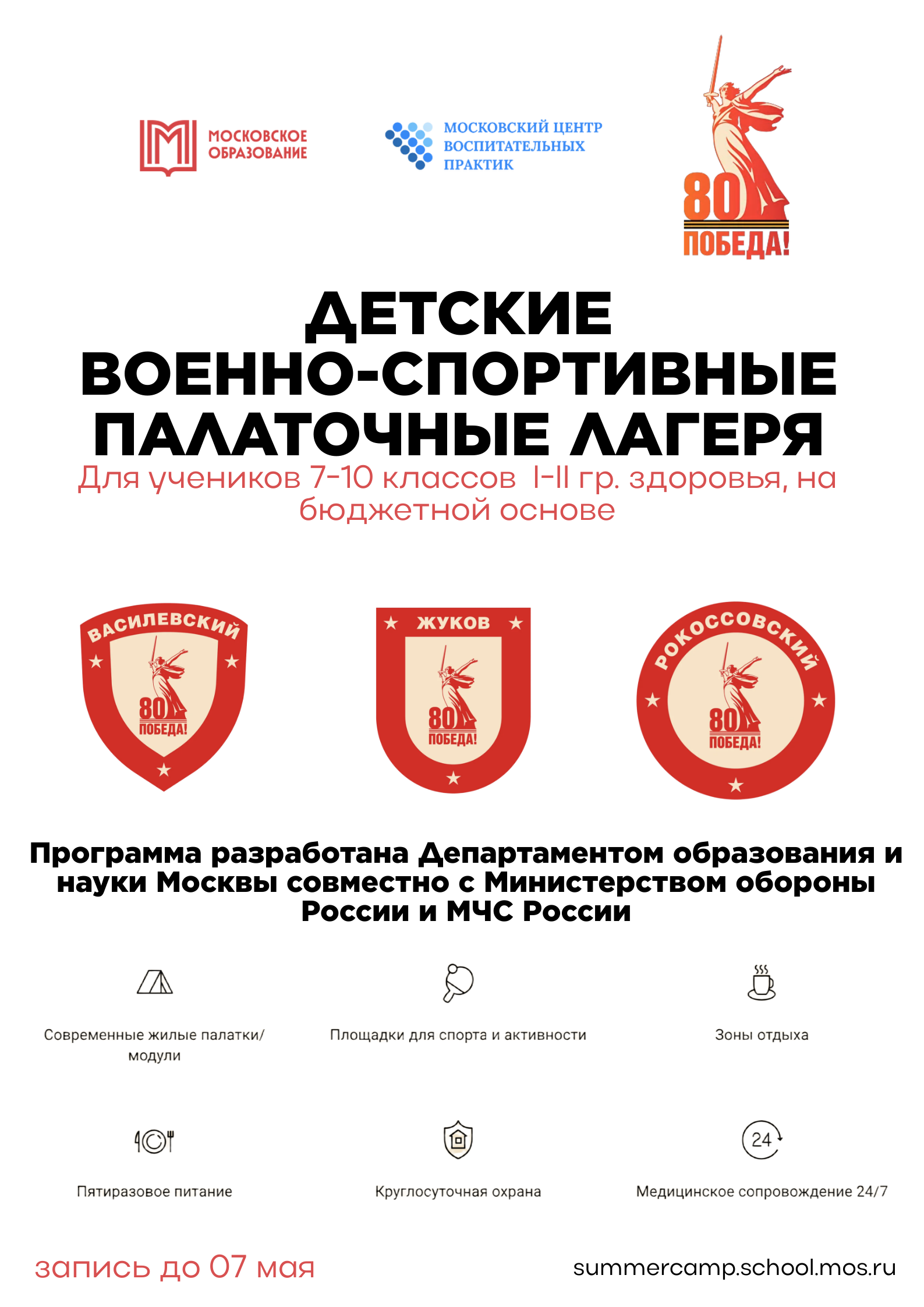 Дорогие родители и ученики! Московское образование приглашает ребят 7-10 классов (14-17 лет) в бесплатные военно-спортивные палаточные лагеря!