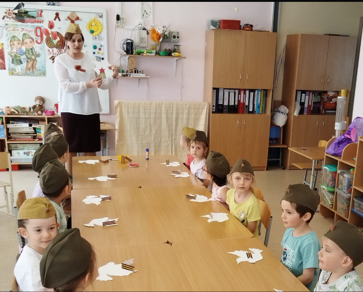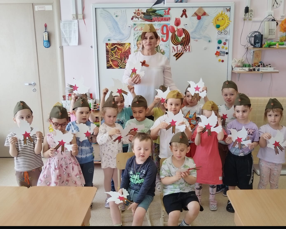 Воспитанники группы № 8 под руководством Пашаевой А.М. и Дмитриевой Д.В. создали аппликацию «Голубь мира», символизирующую мирное небо и благодарность ветеранам. Ребята с большим интересом слушали рассказы воспитателей о значении Дня Победы и важности сохранения мира.